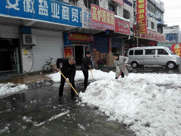下午黨支部組織黨員干部及職工進行義務除雪勞動。不但鏟除公司門前的積雪,還進行漕沖糖酒城市場路面積雪清除,以培養黨員的宗旨意識和奉獻精神。