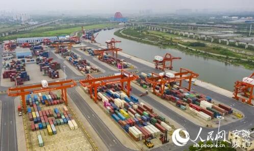 安徽省港航集團旗下的合肥港國際集裝箱碼頭。人民網 張俊攝