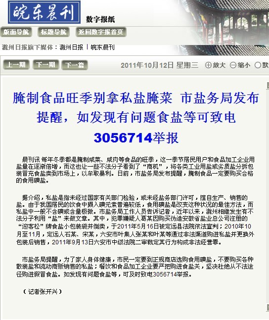 晨刊訊每年冬季都是腌制咸菜、咸肉等食品的旺季,這一季節居民用戶和食品加工企業用鹽量在逐漸倍增,而這也讓一些不法分子看到了“商機”,將各類工業用鹽或劣質鹽分拆包裝冒充食鹽賣到市場上,以牟取暴利。日前,市鹽務局發布提醒,腌制食品一定要購買合格的食用碘鹽。