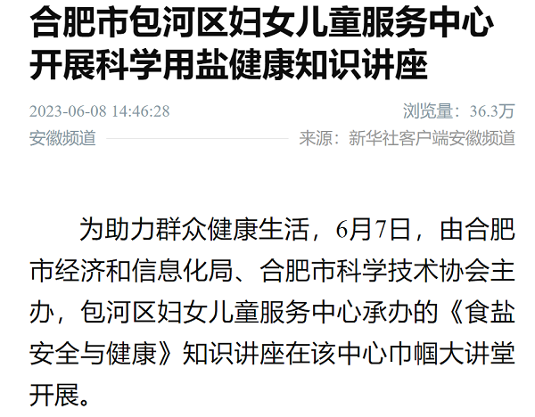 6月8日,新華社客戶端安徽頻道發(fā)表題為《合肥市包河區(qū)婦女兒童服務(wù)中心開展科學(xué)用鹽健康知識(shí)講座》的文章,截至發(fā)稿日瀏覽量達(dá)40.7萬(wàn)人次。