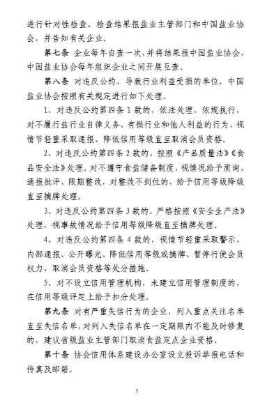 對(duì)違反公約第四條 1 款的(守法合規(guī)),依法處理,依規(guī)執(zhí)行,對(duì)不履行鹽行業(yè)自律義務(wù),有損行業(yè)和他人利益的行為,視情節(jié)輕重采取通報(bào)、降低信用等級(jí)直至取消會(huì)員資格。