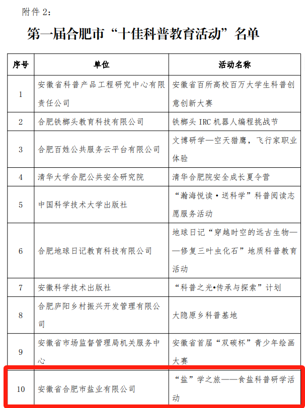 近日,由合肥市科普產(chǎn)業(yè)聯(lián)盟舉辦的第一屆合肥市“十佳展品”“十佳科普教育活動(dòng)”“科普產(chǎn)業(yè)領(lǐng)軍人物”評(píng)選結(jié)果公布,合肥鹽業(yè)“鹽”學(xué)之旅——食鹽科普研學(xué)活動(dòng)榮膺第一屆合肥市“十佳科普教育活動(dòng)”。
